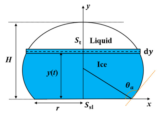 Energy transport between the droplet and the substrate mainly includes heat conduction through the ice layer, which grows along the direction of the positive y-axis, as shown in Figure 8. When the temperature is low, the sensible heat of droplet temperature changes, and heat convection and radiation with the environment are negligible. For a smooth surface, the drop phase change heat transfer rate () at a height of ice satisfies: