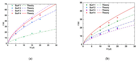 The icing time as a function of the droplet volume on the testing surfaces at −C is plotted in Figure 9a. The icing time from long to short was Surf 3 > Surf 4 > Surf 2 > Surf 1. This was consistent with the wettability of the testing surface. Icing time on the microstructure surface was extended due to a higher surface hydrophobicity. The icing time as a function of the droplet volume on the testing surfaces at −C is plotted in Figure 9b. The icing time from long to short was Surf 4 > Surf 1 > Surf 2 > Surf 3. The contact angle and wetting state of the droplet in contact with the surface were different compared with that at the surface temperature at −C. As for the ultra-low temperature at −C, the droplet morphology on the testing surface was mainly attributed to the heterogeneous nucleation rate. A higher heat transfer rate allowed a short icing time, as expected. However, as aforementioned, a Cassie state with the reduced ice–substrate contact area extended the icing time, which even required a longer time than the freezing time of the Wenzel drop at −C. The icing time measured in the experiment matches well with theory predicted using the heat transfer model.