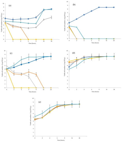 All coatings were tested against bacterial species S. aureus, B. cereus, L. monocytogenes, E. coli, and P. aeruginosa. The growth inhibition curves are shown in Figure 2.
