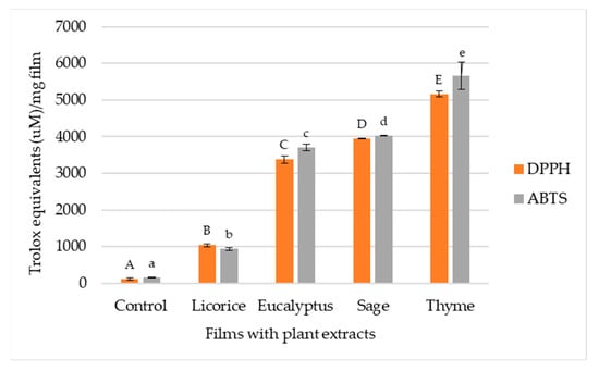 The film incorporated with thyme extract was the one that presented the best antioxidant activity by both ABTS (5654.62 Trolox equivalents (µM)/mg film) and DPPH (5162.93 Trolox equivalents (µM)/mg film), followed by the film with sage extract (ABTS: 4024.17 Trolox equivalents (µM)/mg film; DPPH: 3954.81 Trolox equivalents (µM)/mg film). The film incorporated with eucalyptus extract presented an ABTS value of 3706.30 Trolox equivalents (µM)/mg film and a DPPH value of 3377.97 Trolox equivalents (µM)/mg film. The film incorporated with licorice extract (ABTS: 942.52 Trolox equivalents (µM)/mg film; DPPH: 1040.67 Trolox equivalents (µM)/mg film) was the one with the least antioxidant activity.