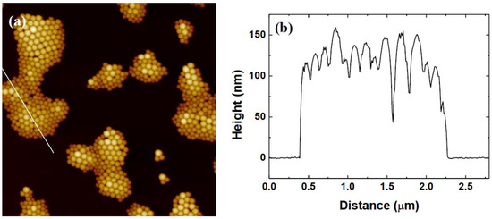 (a) 6 × 6 μm2 topography scan of a colloidal sample prepared using the 10 g/L colloidal suspension and spin-coating program A with (b) height profile corresponding to the white line.
