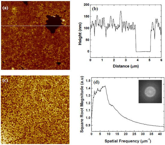 (a) 6 × 6 μm2 topography scan of a colloidal sample prepared using the 25 g/L colloidal suspension and spin-coating program A with (b) height profile corresponding to the white line showing monolayer structure. (c) 6 × 6 μm2 topography scan of a continuous film with (d) corresponding radially averaged profile of 2D-FFT (inset).