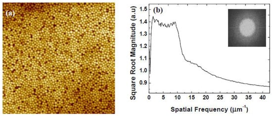 (a) 6 × 6 μm2 topography scan of a colloidal sample prepared using the 50 g/L colloidal suspension and spin-coating program A with (b) corresponding radially averaged profile of 2D-FFT (inset).