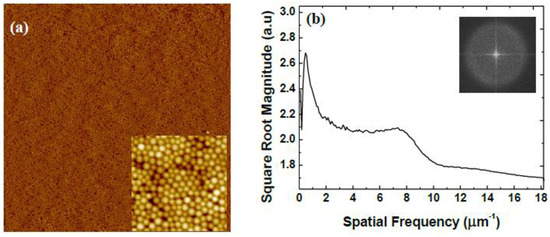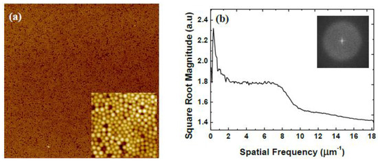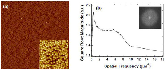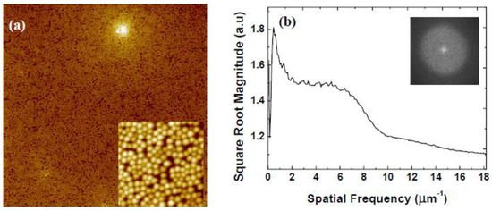 (a) 14 × 14 μm2 topography scan of a colloidal sample prepared using the 50 g/L colloidal suspension with spin-coating program B with an acceleration of 200 rpm/s with zoom inset. (b) Corresponding radially averaged profile of 2D-FFT (inset) of (a).