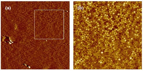 (a) 14 × 14 μm2 topography scan of a colloidal sample prepared using the 50 g/L colloidal suspension with spin-coating program C at a rotational speed of 200 rpm. (b) Corresponding image of the zoomed section marked in (a) shows the structured formation of nanocolloid particles.