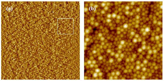 (a) 14 × 14 μm2 topography scan of a colloidal sample prepared using the 50 g/L colloidal suspension with spin-coating program C at a rotational speed of 400 rpm. (b) Corresponding image of the zoomed section marked in (a) shows the structured formation of nanocolloid particles.