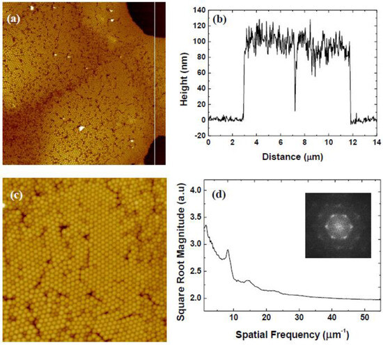 With an increase of the rotational speed to 600 rpm, a large-scale crystallisation of the nanocolloid silica particles across the surface of the substrate was observed (Figure 14a). This particular image was chosen as it has some small voids in the film that allow us to take the height profiles of the film. It should be noted that this is not representative of the majority of the sample area. The highly ordered structures are of a monolayer thickness, as indicated by the height profile in Figure 14b. A smaller topography scan (Figure 14c) illustrates the hexagonal close-packed nature of the film. A multitude of grain boundaries across the surface of the substrate with various crystal orientations was observed. 2D-FFT measurements (Figure 14d) of the topography show a distinctive six-point FFT corresponding to the hexagonal packing of the nanocolloidal particles and a crystal lattice constant of 130 nm.