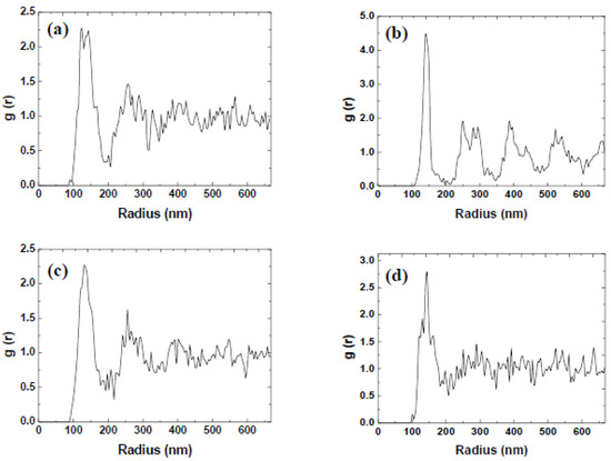 Radial distribution functions of the topography scans of samples prepared using spin-coating program C with rotational speeds of (a) 200 rpm, (b) 600 rpm, (c) 1000 rpm, and (d) 8000 rpm.