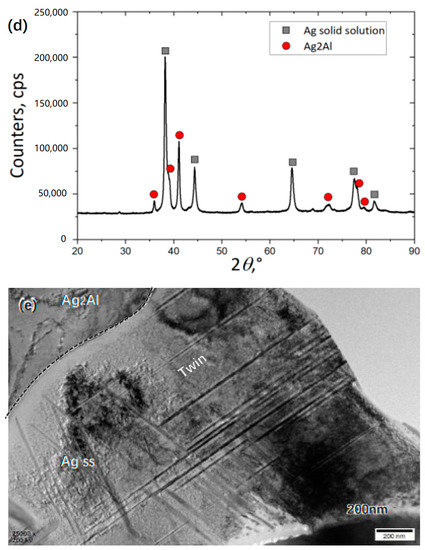 The microstructure of the prepared Ag buffer layer was characterized by TEM, and the images are shown in Figure 2a. The element maps of the indicated region in Figure 2a are shown in Figure 2b,c, as the direction indicated by the arrows in which an Al-rich region and Ag-rich region was observed. The XRD pattern of the Ag buffer layer shown in Figure 2d indicated that the main contents are the Ag2Al and Ag solid solution. Therefore, the Ag-rich region and Al-rich region were Ag solid solution and Ag2Al, respectively. As a buffer layer, this cladded Ag layer trapped the Al element by forming Ag2Al and hence prevented the diffusion of Al into Cu alloy coating; this process is in favor of cracking inhibition (as described in Section 3.1). Specifically, the microstructure of the twin in the Ag solid solution is observed in Figure 2e, which was the result of the plastic deformation of FCC-type Ag solid solution. From the macro aspect, due to this plastic deformation, the Ag buffer layer reduced the thermal stress generated during the heating and cooling process of laser cladding, as mentioned in Section 3.1. This could be one of the main reasons for cracking inhibiting the mechanism.
