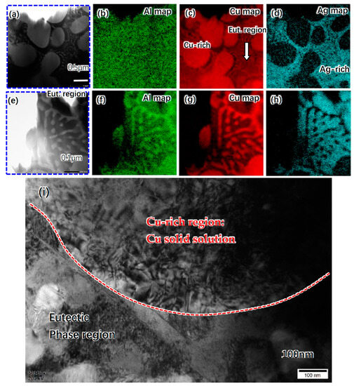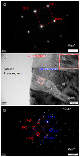(a–d) STEM image and element maps of Cu alloy layer, (e–h) STEM image and element maps of eutectic phase in Cu alloy layer, (i) TEM image of Cu alloy layer, (j) SAED pattern of Cu−rich region, (k) TEM image of eutectic region, (l) SAED pattern of the region in (k), (red for Cu-rich phase and blue for Ag-rich phase), and (m,n) HRTEM images of regions in (k).