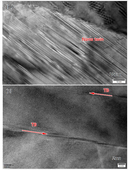 In order to further investigate the crack inhibiting mechanism, the STEM image and element maps of the Cu alloy layer (with Ag buffer layer) are shown in Figure 3a–d, in which the Cu-rich primary phase and Ag-rich eutectic phase were observed as the main constitution. The STEM image and element maps of the eutectic region are shown in Figure 3e–h, in which the Ag-rich region and (Cu, Al)-rich region were characterized. The SAED image of the Cu rich region indicated in Figure 3i is shown in Figure 3j. It can be observed that the primary Cu-rich region (separated by the dash line with eutectic phase region)was FCC-type Cu solid solution. The SAED image of the region indicated in Figure 3k is shown in Figure 3l. It was concluded that the Ag-rich region was FCC-type Ag solid solution. The (Cu, Al)-rich region was FCC-type Cu solid solution. The HRTEM image of the nano twin structure and twin boundaries (TBs) was identified as shown in Figure 3m,n. This indicated that, in the eutectic phase of the Cu alloy layer, twin transformation occurred in the Cu solid solution. As many studies have indicated [19], the twin transformation in the twin boundaries deformation could apparently release inner stress, which greatly helps in inhibiting the cracking tendency.