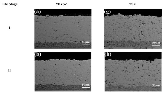 The hardness and elastic modulus of the coating are shown in Figure 9. The hardness of the YbYSZ coating and the YSZ coating showed an increasing trend with the increase in the number of thermal cycles, and the hardness increased by 15.0% and 19.4%, respectively, which was caused by the decrease in the coating porosity under the action of sintering. In addition, the heating and cooling processes in the thermal cycle would cause changes in the thermal stress and residual stress inside the coating. Due to the difference in coefficient of thermal expansion, the coating will be subjected to compressive stress. As the thermal cycle progresses, these residual stresses will gradually accumulate, resulting in an increase in the hardness of the coating. In the I life stage, the hardness of the YbYSZ coating is higher than that of the YSZ coating. Thanks to the doping of rare earth element Yb3+, the mechanical properties of the YbYSZ coating are improved [26]. The increase in hardness can improve the erosion resistance of the thermal barrier coating, thus increasing its service life [27]. In the remaining life stage, the hardness of the YbYSZ coating is lower than that of the YSZ coating, which is due to the better sintering resistance of the YbYSZ coating, which provides more pores for the infiltration of more CMAS, and the hardness of the glass phase generated after cooling is lower, thus reducing the average hardness of the YbYSZ coating.