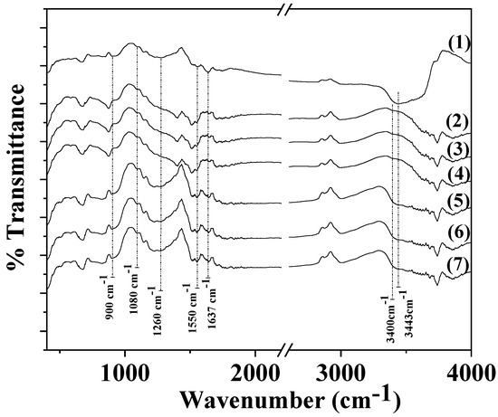 In the FTIR plot of the pure CS/PVOH film (see line (1) in Figure 3) there are obtained reflections of both CS and PVOH polymers. The large band at 3443 cm−1 is assigned to the stretching vibration of hydroxyl groups of both CS and PVOH [29]. At 3400 cm−1 is assigned the primary stretching vibration of amino groups of CS [29]. The reflections at 1637, 1550, 1260, 1080, and 900 cm−1 are redshift of C-H stretching, C-O stretching, N-H bending, and O-H stretching of CS due to the strong relaxation with PVOH chains [42]. In the case of both CS/PVOH/xAC (see lines (2), (3), and (4) in Figure 3) and CS/PVOH/xTO@AC (see lines (5), (6), and (7) in Figure 3) FTIR plots the characteristic reflections of AC are observed in advance to CS/PVOH matrix reflections. The band at 1260 cm−1 is assigned to the stretching vibration of the C-O groups. The band with a maximum of about 3420–3440 cm−1 is assigned to the O-H stretching mode of hydroxyl groups of the adsorbed water molecules [37]. With a careful glance at the CS/PVOH/xAC and CS/PVOH/xTO@AC FTIR plot, the result is that, in the case of CS/PVOH/xTO@AC, the reflection at 1260 cm−1 increased, implying a bigger relaxation and interplay between CS/PVOH N-H groups and TO@AC C-O groups. In advance in the case of CS/PVOH/xTO@AC FTIR plots, the reflection of the primary stretching vibration of amino groups of CS at 3400 cm−1 is more intense than in the case of CS/PVOH/xAC FTIR plots where the same reflection almost disappeared. This is also implying the higher relaxation of N-H groups of the CS/PVOH matrix with the O-H groups of the TO@AC nanohybrid.