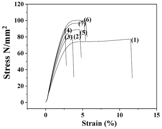 Stress-strain curves of (1) CS/PVOH, (2) CS/PVOH/5AC (3) CS/PVOH/10AC, (4) CS/PVOH /15AC, (5) CS/PVOH /5TO@AC, (6) CS/PVOH/10TO@AC, and (7) CS/PVOH /15TO@AC obtained films.