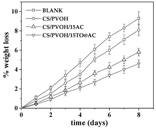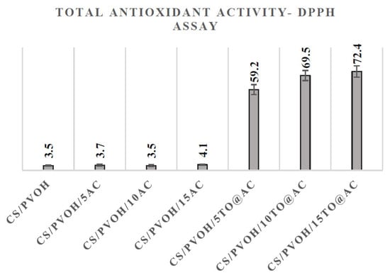The % total antioxidant activity of all CS/PVOH/xAC and CS/PVOH/xTO@AC films as well as pure CS/PVOH after 24 h of incubation are plotted in Figure 5. As it was expected, pure CS/PVOH and all CS/PVOH/xAC films showed small values of total antioxidant activity due to the presence of CS, which is known to have antioxidant activity [43]. For CS/PVOH/xTO@AC films, a significant % total antioxidant activity values are obtained due to the presence of TO molecules [44]. As the wt.% content of TO@AC use increased, the obtained % total antioxidant activity values increased further. It must also be underlined that the values obtained here for CS/PVOH/xTO@AC are much higher than the values reported recently for CS/PVOH/xTO@AC films with the same method, implying the superiority of AC against HNT as TO molecule nanocarriers for control release applications [45].