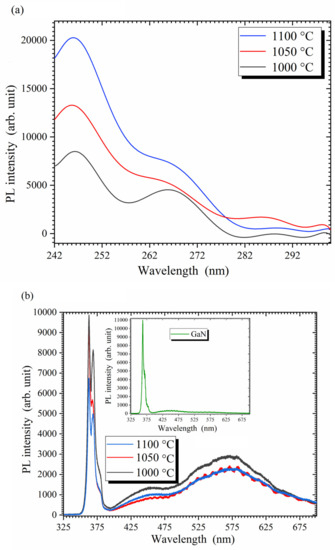 (a) PL emission spectra of the samples thermally oxidized at 1000, 1050, and 1100 °C, measured at room temperature, in the wavelength range of 242 to 300 nm. Excitation of the emission was performed at 230 nm using a xenon lamp with grating filtering. (b) PL emission spectra of the samples thermally oxidized at 1000, 1050, and 1100 °C, measured at room temperature, in the wavelength range of 325 to 700 nm. The inserted image represents the PL spectrum of the undoped GaN substrate. Excitation of the emission was performed using a 325 nm He-Cd laser.