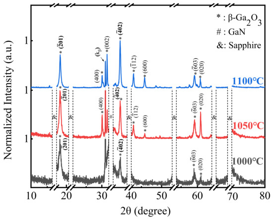 Normalized XRD patterns of samples thermally oxidized at 1000, 1050, and 1100 °C compared with ICDD file PDF# 43-1012 for β-Ga2O3, PDF# 50-0792 for GaN and PDF# 50-1496 for sapphire.