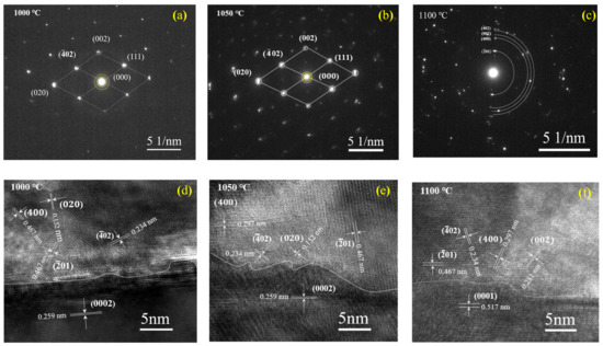 Figure 3a–c depict the SAED pattern obtained from a detailed characterization of the grown β-Ga2O3 film. The discrete bright spots observed in the pattern correspond to β-Ga2O3 crystal planes (01), (02), (002), (111), (020), and (400). These findings provide further evidence of the polycrystalline nature of the thin β-Ga2O3 film. Furthermore, the HRTEM images of the region near the β-Ga2O3/GaN interface for the samples thermally oxidized at 1000, 1050, and 1100 °C are shown in Figure 3d–f. These images reveal a distinct boundary between the β-Ga2O3 film and the GaN substrate, without a transition zone. Moreover, the crystal plane orientations observed in the HRTEM images confirm the polycrystalline nature of the thin β-Ga2O3 film.