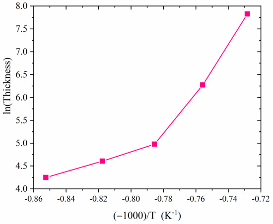 Figure 4 presents a cumulative plot of the natural logarithm values of the oxide layer’s thickness (ln(Thickness)) in nm as a function of the reciprocal of the oxidation temperature ((−1000)/T) in Kelvin for samples oxidized at temperatures of 900, 950, 1000, 1050, and 1100 °C. It is evident from Figure 4 that the plotted curve does not exhibit a completely linear relationship within the oxidation temperature range of 900 to 1100 °C. However, for the purposes of this study, an idealized assumption was made, in that the activation energy in Equation (2) was assumed to remain constant regardless of the oxidation temperature. Based on this assumption, Equation (2) was used to calculate the thickness of the oxide layer at two different temperatures (T_1 and T_2), resulting in the derivation of Equation (3) which eliminates the unknown constant A: