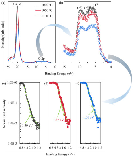 Figure 6a–e presents the valence band characteristics of the samples thermally oxidized at 1000, 1050, and 1100 °C, which were investigated using XPS. Previous theoretical studies [43,44] and experimental findings [45,46] have shown that the density of states in the valence band is primarily attributed to the characteristics of O 2p. The Ga 3d peak was used as a calibration peak. With an increasing oxidation temperature, the valence band edge of O 2p shifted further to the right (Figure 6a,b), indicating a lower Fermi level and a more distinct p-type nature. Moreover, Figure 6c–e provides enlarged views of the tail parts of the valence band for the samples thermally oxidized at 1000, 1050, and 1100 °C, respectively. The y axis of Figure 6c–e, representing counts per second (counts/s), is normalized to the maximum value ranging from 0 to 5 eV. The slope variation at the turning point of the tail confirms the existence of states in the lower part of the bandgap. As the oxidation temperature increases, the shallow acceptor levels introduced by N doping move closer to the valence band, indicating a higher p-type carrier density and thus an improvement in p-type conductivity.