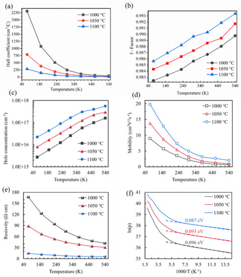 The variations in (a) the Hall coefficient, (b) f-Factor, (c) Hall hole concentration, (d) Hall hole mobility, and (e) Hall resistivity as a function of the test temperature for the samples thermally oxidized at 1000, 1050, and 1100 °C. (f) The natural logarithm plot of the Hall hole concentration (ln (p)) as the function of (1000/T).