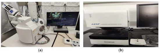 Macroscopic view of the main experimental instruments: (a) scanning electron microscope; (b) 3D confocal microscopy (LSCM).