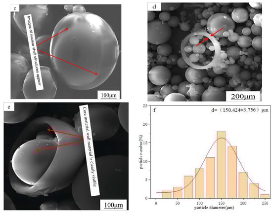 Figure 2 shows the SEM morphology and particle size distribution of the microcapsules and microstructure. Figure 2a shows the SEM image of microcapsules loaded with glycerol at 500 μm. It can be seen from the figure that the microcapsules are relatively uniform in both distribution and size. Local rupture appears, and the core–shell structure can be seen initially from the rupture. Figure 2b shows the SEM image of the microcapsules at 200 μm, and further magnification shows that the surface of the microcapsule is smooth and round and that the size distribution is relatively uniform. Figure 2c shows the SEM image of a single microcapsule, which is the moment when the magnification could be maximized and a clear image could be taken under the right conditions. At 100 μm, the synthesized capsule appears spherical, then becomes very round and smooth again. The core and wall states of the core–shell structure can be seen under reflection, in addition to the compact distribution of the capsule-forming structure. Figure 2d shows the SEM cross-section of the microcapsules rupture. The total thickness of the outer and inner walls of the capsule is about 15 μm, and Figure 2e shows the SEM image at a magnification of 100 μm. At this time, not only can the core–shell structure be clearly seen, but also the change distribution of microcapsule particle size can be seen. The observed results correspond to the particle size distribution detected by the laser particle size tester. Figure 2f shows the particle size distribution of the microcapsules, ranging from (150.424 ± 3.756) μm, which is consistent with the Gaussian nonlinear fitting results.