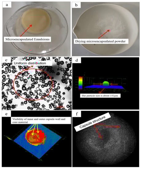 Macrostructure of prepared microcapsule and particle size under core–shell structure: (a) optimal emulsion; (b) microcapsule powder; (c) emulsion dispersion under optical microscope (OM); (d) particle size under 3D confocal microscope (LCSM); (e) inner capsule wall under 3D confocal microscope (LCSM); (f) capsule structure under 3D confocal microscope (LCSM).