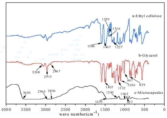 FTIR spectra of microcapsules, glycerol and ethyl cellulose: (a) ethyl cellulose; (b) glycerol; (c) microcapsules.