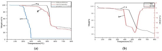 Fourier infrared spectra (TGA) plots of self-healing microcapsules: (a) a, ethyl cellulose; b, microcapsules; c, propanetriol; (b) a, TG; b, DTG.