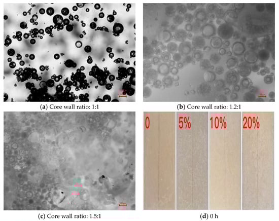 Figure 4a shows the FTIR spectrum of ethyl cellulose in the wall material. In the above peaks of organic functional groups, the tensile vibration of C-C aromatic ring ranges from 1586 to 1467 cm−1. The characteristic peak corresponding to the microcapsules in Figure 4c is 1439 cm−1. Meanwhile, the O-H-O asymmetric tensile vibration ranges from 1316 to 1289 cm−1. The peak value of C-O-C stretching vibration is 1227 cm−1. This corresponds to microcapsules at the characteristic peak of 1240 cm−1. Figure 4b shows the FTIR spectrum of glycerol. There is a stretching vibration at the 3248 cm−1 peak for the -OH bond and an asymmetric stretching vibration at the 2913 cm−1 peak for the -CH2 bond. There is a symmetric stretching vibration for the -CH2 at the 2867 cm−1 peak and a bending vibration for the -CH2 bond at the 1407 cm−1 peak. The symmetric stretching vibration peak of C-O ranges from 1132 to 1030 cm−1, and that of the secondary alcohol is at 839 cm−1. These peaks coincide with those of the microcapsule at 2964 cm−1. The results showed that the characteristic peaks of ethyl cellulose and glycerol reacted in microcapsules. This also confirmed that glycerol was successfully encapsulated in the microcapsules.