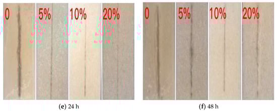 Figure 7 shows the corrosion effect of the coated samples with different amounts of microcapsules in artificial seawater. For pure epoxy resins without microcapsules. With the increase in soaking time, corrosion appeared in the scratch area, and the corrosion outside the scratch was more obvious. As can be seen from figure b, when the microcapsule content is 5%, compared to the pure epoxy coating, the scratches become shallower and lighter under the same soaking time. This indicates an initial ability to self-healing, and when the microcapsule content is 10%, only a small amount of corrosion occurs around the coating. This indicates that the microcapsules will release the core material, propanetriol, over time when the coating is scratched or broken. However, glycerol is a polar molecule, and the unshared electron pair of the oxygen element on the polar group combines with the hydrogen ion. This causes cations to adsorb on the substrate surface, which changes the structure of the double electric layer on the surface of the substrate, producing a covering effect, forming a hydrophobic coating and weakening the movement of hydrogen ions, chloride ions and water molecules. In turn, this weakens the access to the solution substrate and hinders charge transfer. Moreover, anode polarization occurs, thereby reducing the corrosion rate and self-healing, and hindering further corrosion. When the microcapsules content in d is 20%, the ratio between microcapsules and epoxy resin becomes larger. As a result, the epoxy resin inside the microcapsule cannot be evenly dispersed and cannot be scratched at the scratch site, and the corrosion resistance is weakened as the soaking time increases. It can be seen that when the microcapsule content is 10%, the self-healing ability is the best, which is consistent with Figure 6.