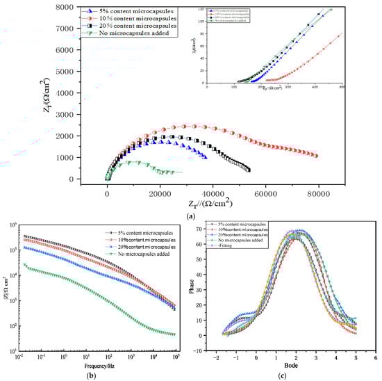Electrochemical impedance spectra of coatings with different self-healing microcapsule additions in 3.5% NaCl solution: (a) Nyquist plot; (b) impedance vs. frequency Byrd plot; (c) Bode diagram of phase angle and frequency.