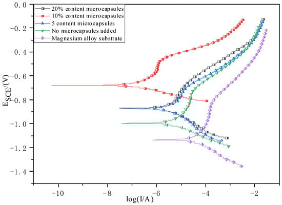 Figure 8 above shows the electrochemical impedance spectra of different self-healing microcapsules added to the 3.5% NaCl solution. Figure 8a shows the Nyquist diagram. The impedance modulus values in the low frequency region are 2.8 × 104, 3.6 × 104, 7.8 × 104, and 5.3 × 104, respectively. As the radius of the capacitive resistance of the capacitive arc in solution gradually increases, the corresponding resistance of the solvation layer also increases. The charge transfer resistance becomes more pronounced, which in turn hinders further erosion of the coating by the solute in solution. Moreover, when the microcapsule addition amount is 10 wt.%. The coating has the best self-healing ability, indicating that it has the best corrosion resistance at this moment. Compared to the pure epoxy coating without the addition of microcapsules, its corrosion resistance is poor. Also in the Byrd plot in Figure 8b, it can be seen that the |Z| value increases continuously in the absence of the microcapsules up until they are added up at 10 wt.%, but the value decreases at a microcapsule content of 20 wt.%. This indicates that the self-healing coating exhibits optimal impedance coating volume with a stable passive response at 10 wt.% microcapsule content [40]. The self-healing epoxy coating successfully prevented the electrolyte solution from penetrating into the substrate and coating surface. The corrosion inhibitor released by the microcapsule is adsorbed at the corrosion site. It successfully inhibits the corrosion process. The appearance of double peaks can clearly be observed in Figure 8c, indicating that the self-healing coating was successfully coated at this time and has a double-layer structure. This indicates that the corrosion resistance of the coating is optimal when the microcapsule content is 10 wt.%. In Figure 9, the error between the data fitted in the figure and the experimental data is minimal, so the equivalent circuit can be used to fit the coating data of the optimal microcapsule addition amount, where CR and CP are, respectively, the annual corrosion rate and anti-corrosion efficiency on the Tafel curve. Ecorr mainly describes the corrosion thermodynamic trend of the coating, and Icorr is the corrosion current density. In general, the main criterion of corrosion resistance is determined by the corrosion current density. The lower the current density, the lower the corrosion rate accordingly. Epoxy resin varnish coatings and self-healing coatings have orders of magnitude lower current densities compared to magnesium alloy substrates. In addition, the self-healing coating worked better in the sodium chloride solution. The reason is that the coating successfully resists the penetration of the electrolyte solution to the substrate and the coating surface. The corrosion inhibitor released by the microcapsule is adsorbed at the corrosion site. The corrosion process was successfully suppressed, which is also consistent with the polarization curve analysis in Figure 10 below.