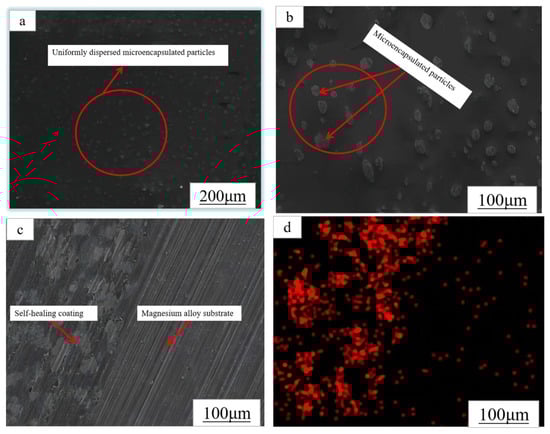 Figure 11 shows the planar SEM image, sectional SEM image and the corresponding sectional EDS spectra of the epoxy resin coating with optimal microcapsule dosage. At the magnification of Figure 11a, 200 μm, it can be seen that the encapsulated small particles are uniformly dispersed on the surface of the self-healing coating. This indicates that the microcapsules at the optimal content are well formed by stirring and curing after being added to the epoxy resin coating. When the coating is damaged by external forces, the microcapsules encapsulated in the coating can flow out in time to release the retarding agent, glycerin. In turn, the coating provides good protection against corrosion. Figure 11b shows the enlarged view in a. At this time, under the amplification size of 100 μm, the structure of the microcapsule can be seen increasingly clearly, and the dispersion is very good. Figure 11c shows the cross-sectional SEM image of the epoxy resin coating at the optimal microcapsule dosage. Figure 11d shows the EDS energy spectrum of the corresponding cross section in Figure 11c, which corresponds to the overall face-swept element distribution. The thickness of the self-healing coating is 95–100 μm. It is clearly seen that the incorporation of microcapsules results in a tighter adhesion of the coating to the magnesium alloy substrate and thus excellent corrosion resistance.