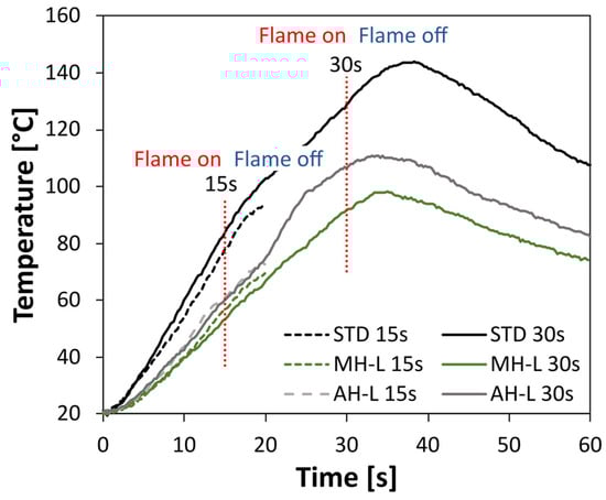 Preliminarily, in order to evaluate how the reaction to fire of the coated steel samples evolves during the flame impingement test, Figure 3 shows the evolution of the backside temperature of three types of coatings, a standard coating (STD), which is not flame retardant, and two heat insulating coatings. For this comparison, the magnesium hydroxide (MH-L) and aluminum hydroxide (AH-L) based coatings were considered. Results related to a fire exposure of 15 s and 30 s are, furthermore, compared.
