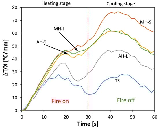 The greater the ΔT/X, the more effective the thermal barrier provided by the functional coating. The TS system (reference thermal protective coating) exhibits a bimodal trend, characterized by two very distinct peaks, occurring at approximately half of the heating and cooling cycle, respectively. The coating has a good protective action with a maximum ΔT/X equal to ~20 °C/mm. The addition of FR based on Al(OH)3 implies an improvement in thermal performance, with an evident increase in fire protection of the metal substrate. This effect is evident throughout the measurement range of the test. The maximum deviation with respect to the STD specimen is achieved during the cooling phase at approximately 45 s for the AH-S sample equal to 47.5 °C/mm.