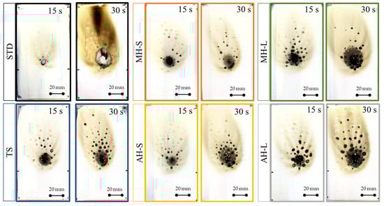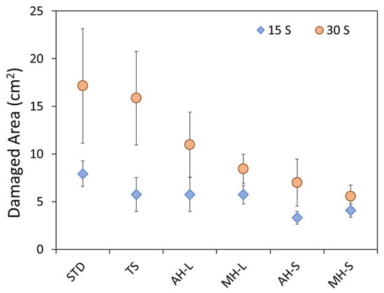 It can be noted that the unmodified reference TS batch shows a small FDZ damaged area at low exposition time. At high exposition time, the results are almost compatible with the STD one. This implies that the TS specimen shows adequate fire-retardant behavior only at low exposure times. Its protective efficacy is significantly reduced for longer exposure times. Conversely, there is a significant reduction in the damaged area, even at long exposure times, for the modified coatings. Magnesium hydroxide appears to show better efficacy than aluminum hydroxide. Furthermore, low grain size fire-retardant compounds exhibit the most satisfactory results. Best results were observed for the MH-S batch, where an FDZ damage area equal to 4.1 cm2 and 5.6 cm2 was observed for 15 s and 30 s of exposition to direct flame, respectively.