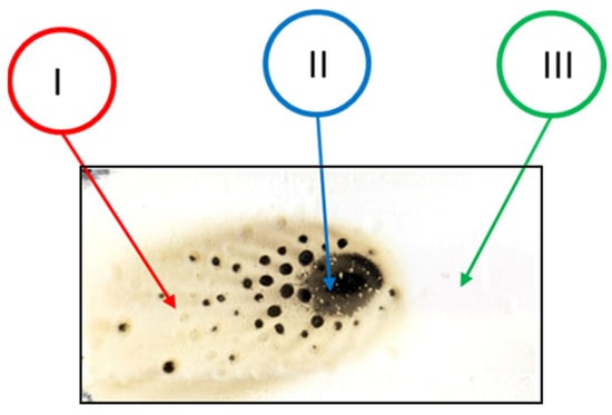 After flame testing, the coatings reveal an area affected by combustion, consisting of three coded zones labeled as I, II, and III. Zone I represents the flame propagation region. Zone II indicates the area of contact between the flame and the paint and, as a result, it is the most darkened portion of the sample. Zone III is the white region where the flame did not propagate, and it closely resembles the fresh sample, i.e., the sample before conducting the tests. Figure 6 illustrates the three zones just described.