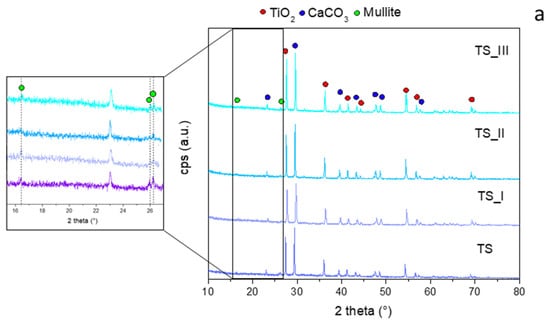In Figure 7a, it is possible to observe that there are no structural differences between the sample before the fire test and the ones conducted on the three investigated zones after the flame experiment of the TS sample. All diffractograms show a clearly crystalline structure, mainly composed of two phases: TiO2 (JCPDS #89-552) and CaCO3 (JCPDS #1-83-1762). The less intense peaks of mullite (JCPDS #4-9-3667) are also noted.