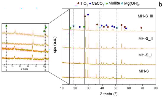 However, in the case of the MH-S sample, Figure 7b shows a clear difference between the diffractogram of MH-S_II and the other ones. In fact, in this case, the brucite peaks (JCPDS #7-0239, 2theta: 18.6°, 38°, and 51°) disappear, resulting from its dehydration during the combustion of the coating.