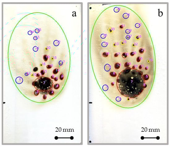Discretization by digital image analysis of fire damage events in AH-L sample exposed for (a) 15 s and (b) 30 s to direct flame.