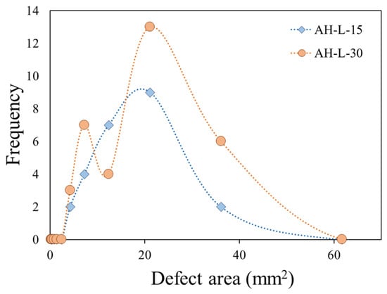 Based on the applied discretization process, an analysis of the frequency distribution of the fire-induced defect areas was conducted. Figure 9 shows the frequency plot in AH-L samples exposed for 15 s and 30 s to direct flame. The AH-L-15 sample exhibits a single cluster of defects with an intermediate area (~12.5–22.5 mm2), due to a partial activation of fire-induced degradation phenomena. Instead, the AH-L-30 sample, exposed for 30 s to direct flame, is characterized by two well-defined peaks at low and high dimension. The former peak, with a maximum at 7.2 mm2, can be related to the formation of new degraded nuclei, which extend further away from the flame zone. The second peak correlated to greater area defects (the maximum of the peak at about 21.1 mm2) is instead attributable to the growth of the defects colony observed at the end of the 15 s exposure test.