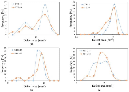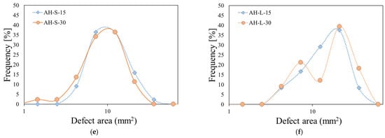 Frequency percentage plot of flame-induced defect area distribution for all samples exposed for 15 s and 30 s to direct flame. (a) STD; (b) TS; (c) MH-S; (d) MH-L; (e) AH-S; (f) AH-L.