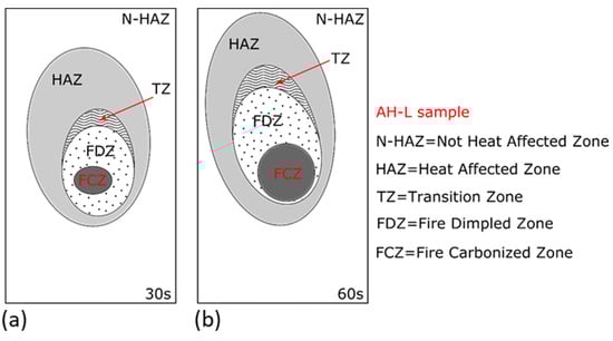 Scheme of evolution of fire damage zones for (a) AH-L-15 and (b) AH-L-30 samples.