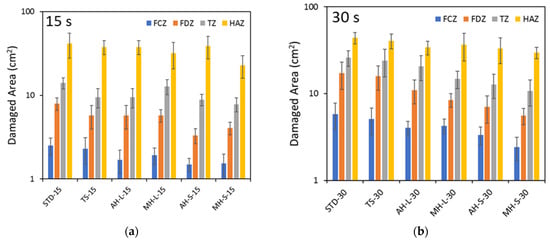 Area of damage zones for all batches exposed for (a) 15 s and (b) 30 s to direct flame.