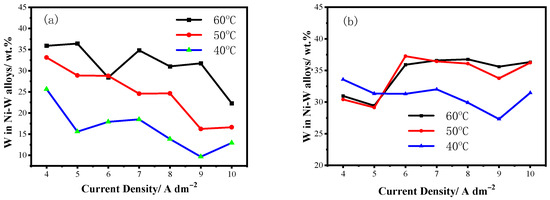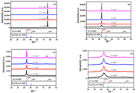 When simultaneously increasing the CW and Tb, the (1 1 1) peak becomes wide and low, as shown in Figure 1d, implying the formation of an amorphous structure. The higher CW and Tb is beneficial to the W deposition during the electrodeposition of the Ni–W alloy. Under this condition, the (1 1 1) peak hardly rises with the current density; that is, current density has no effect on the crystallinity of Ni–W alloys.