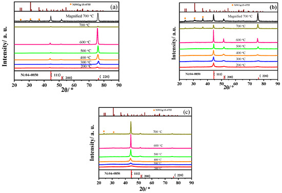As shown in Figure 4b, there is the (111) preferred texture in the W111 sample until a temperature of 500 °C is reached. During heat treatment below 500 °C, there is almost no growth of the (111) crystal surface, while the (2 0 0) and (2 2 0) plane distinguishably grew. The oxidization of Ni–W also happened at 700 °C.