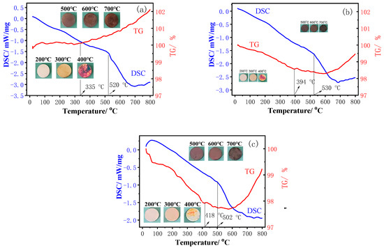 The TG curves present the different shapes. It can be seen from Figure 5 that for the W220 sample, there is almost no change in weight below 335 °C, and then, the weight increases. At the same time, the surface of W220 appears red and even brown at 400 °C, as shown in the insets of Figure 5a.