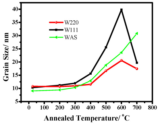 The microhardness of the three textured Ni–W alloy coatings is shown in Figure 7. The microhardness of the as-deposited W220, W111 and WAS samples ranged from 550 to 600 HV, being similar to the reported value of 460–740 HV [17]. It can be seen that the microhardness of WAS with the highest W content is highest within the entire annealed temperature range because of the solid solution strengthening effect of W [25]. Below 400 °C, the microhardness of the three textured Ni–W alloy coatings rapidly improved after heat treatment, being attributed to the elimination of residual stress and grain refinement crystallization [6,17].